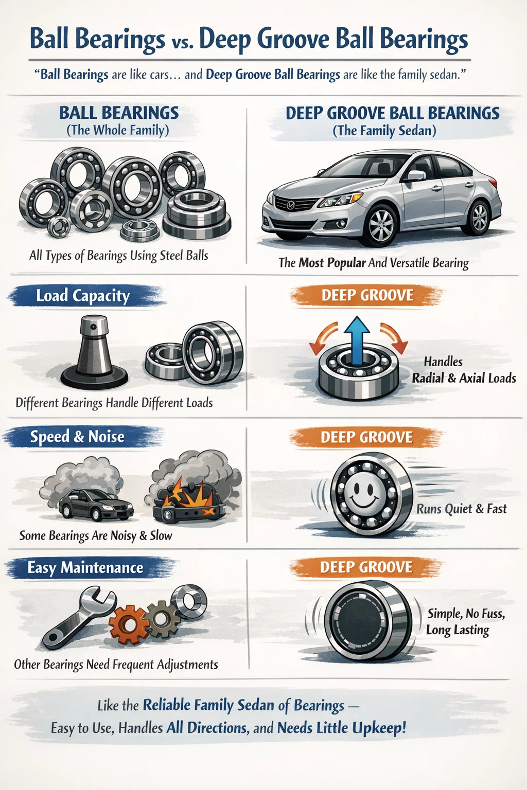 আপনি বল বিয়ারিংগুলিকে "কার" হিসাবে ভাবতে পারেন এবং গভীর খাঁজ বল বিয়ারিং সবচেয়ে সাধারণ হিসাবে "পারিবারিক সেডান।"