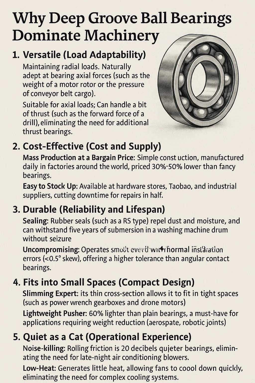 সিলিং: রাবার সিলগুলি (যেমন আরএস টাইপ) ধুলা এবং আর্দ্রতা পিছিয়ে দেয় এবং জব্দ ছাড়াই একটি ওয়াশিং মেশিন ড্রামে পাঁচ বছরের নিমজ্জনকে সহ্য করতে পারে। আপোষহীন: এমনকি সাধারণ ইনস্টলেশন ত্রুটিগুলি (<0.5 ° স্কিউ) দিয়েও মসৃণভাবে পরিচালনা করে, কৌণিক যোগাযোগের বিয়ারিংয়ের চেয়ে উচ্চতর সহনশীলতা সরবরাহ করে।